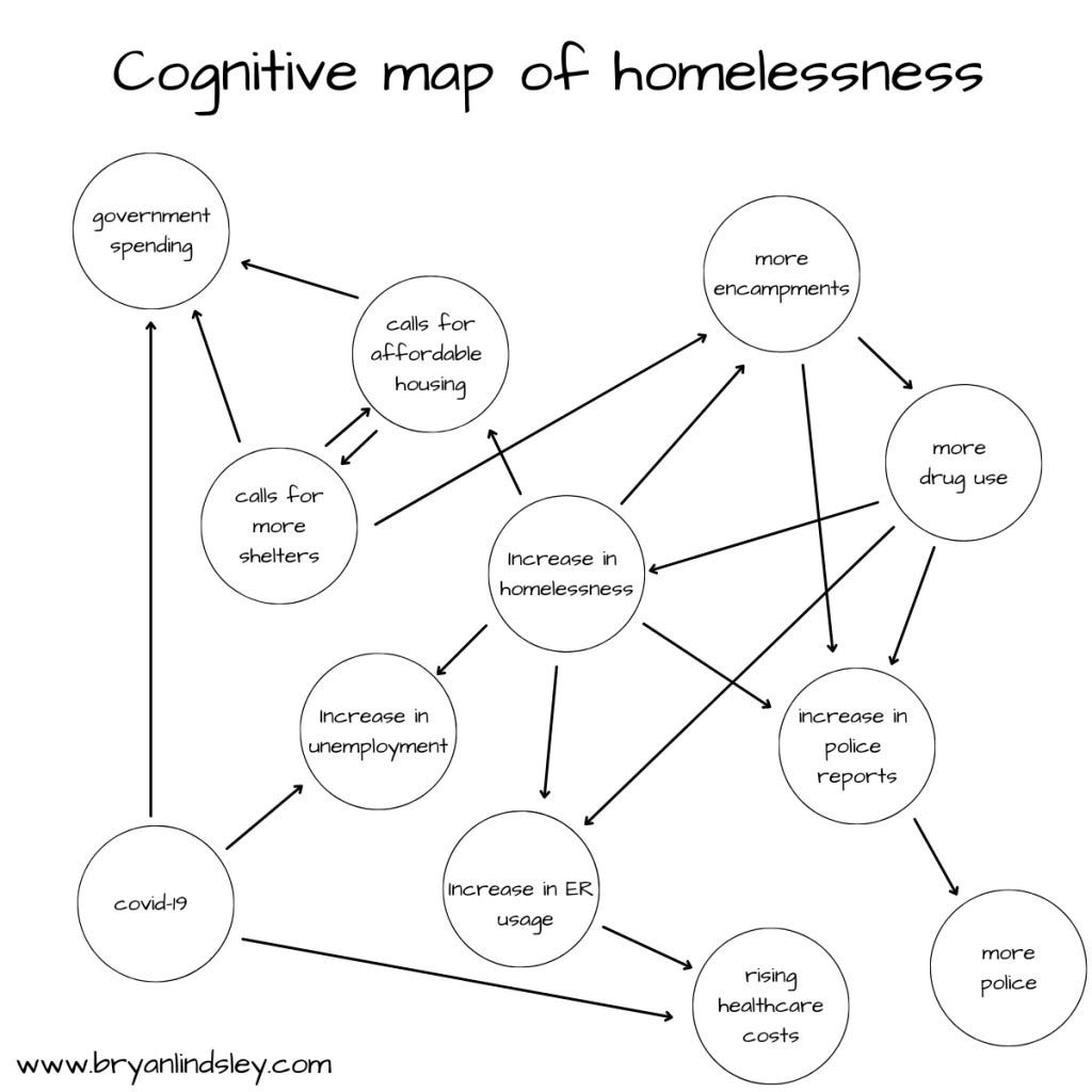 #39. Cognitive mapping: Cognitive mapping is a method of creating a visual representation of a concept or process. Concepts are connected with arrows and linking phrases like “increases”, “causes”, or “is a part of”. Cognitive mapping has been used in Strategic Options Development and Analysis (SODA), where operational research (OR) interviews mappers and facilitates group processes to learn from the map. Mind mapping can be similar but instead of a free-form map it typically uses a tree structure. There are many concept- and mind-mapping software options.