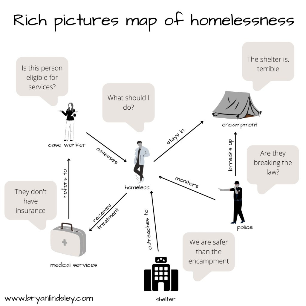 #38. Rich pictures: Originally developed as part of Soft Systems Methodology by Peter Checkland, rich pictures is an individual or group method of creating a visual representation of an ill-defined or complex situation. The purpose is not to define the problem structure or logic model (unlike some of the mapping tools below), but to actively reflect on various perspectives about the situation.