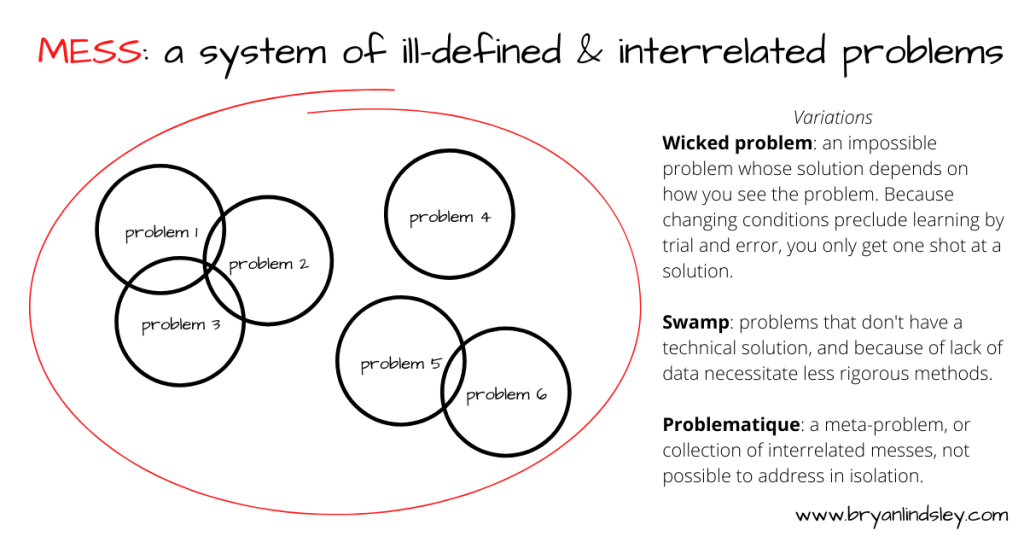 #1. Mess: Coined by Ackoff in 1974, a mess is not just one problem, but a system of interrelated problems. The related insight, according to Ackoff, is that “the sum of the optimal solutions to each component problem taken separately is no an optimal solution to the mess.”